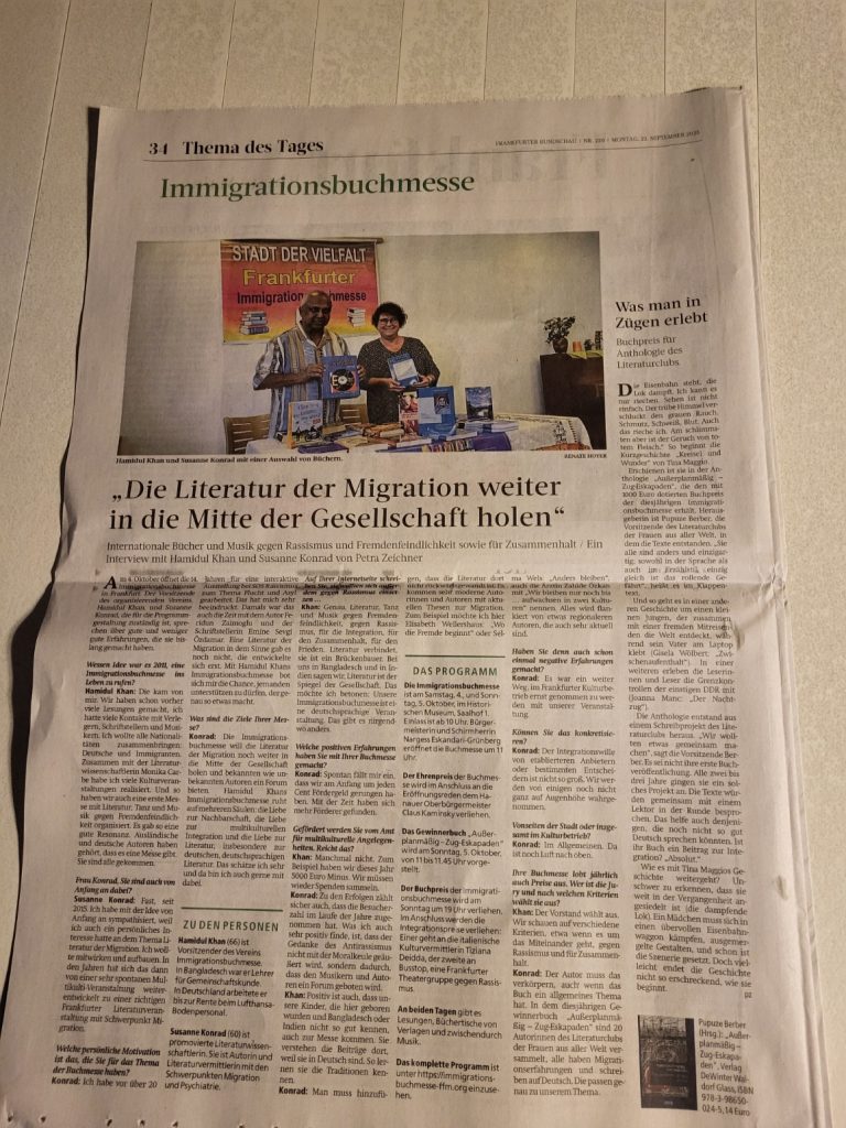 Die Immigrationsbuchmesse findet dieses Jahr vom 04. – 05.10. im Historischen Museum statt. Im Rahmen der Buchmesse werden wir eine Lesung aus unserer Anthologie am 05.10. um 11 Uhr haben. Die Preisverleihung ist am selben Abend um 19 Uhr. Das ganze Programm dazu im Link unten.